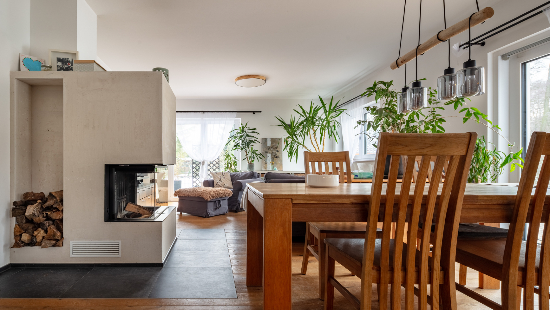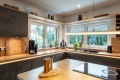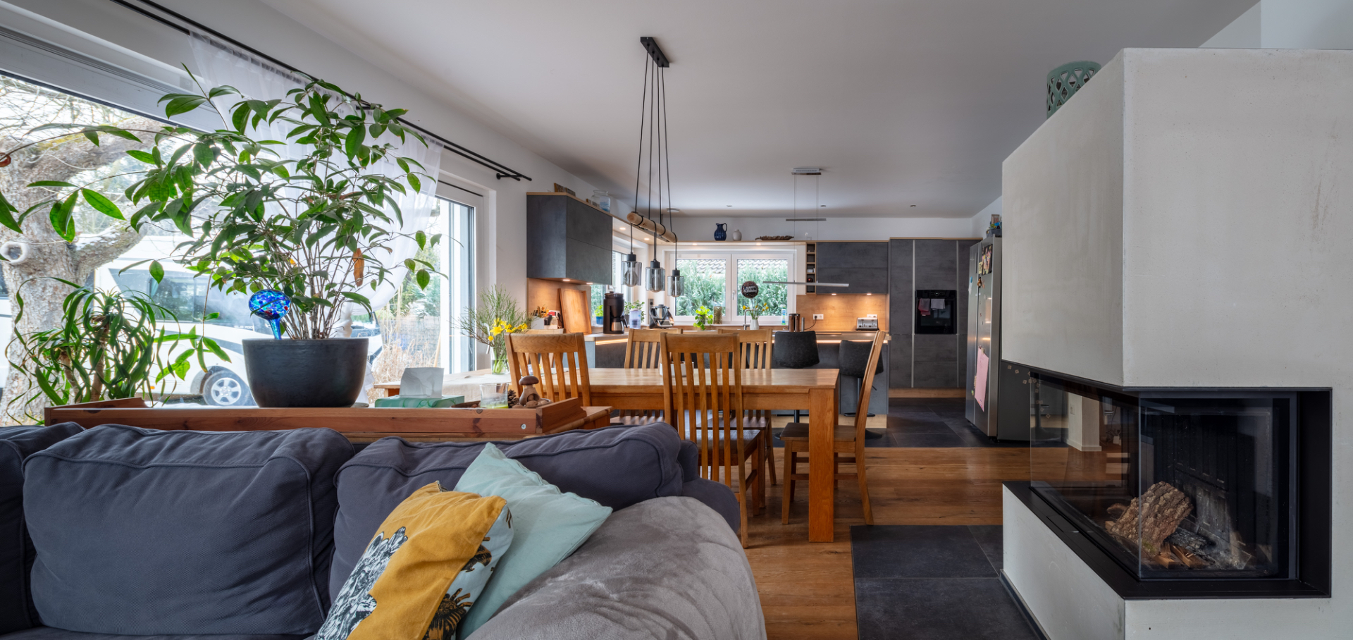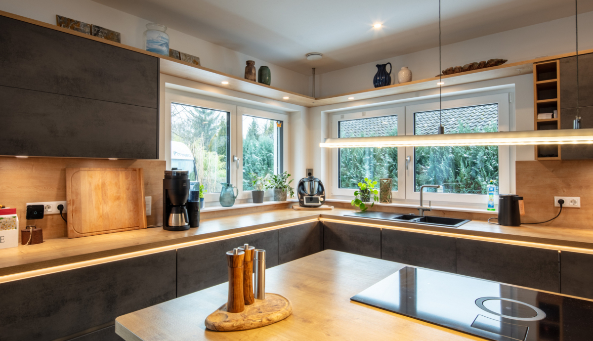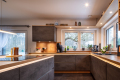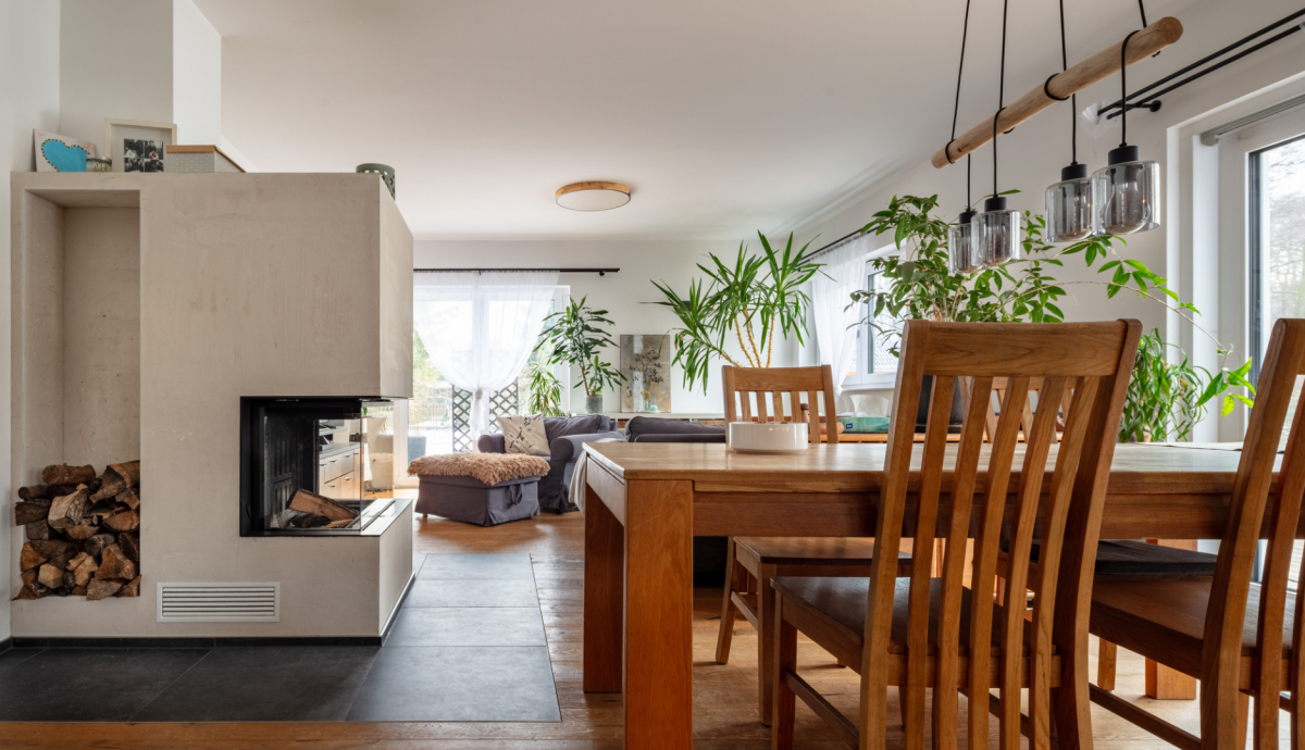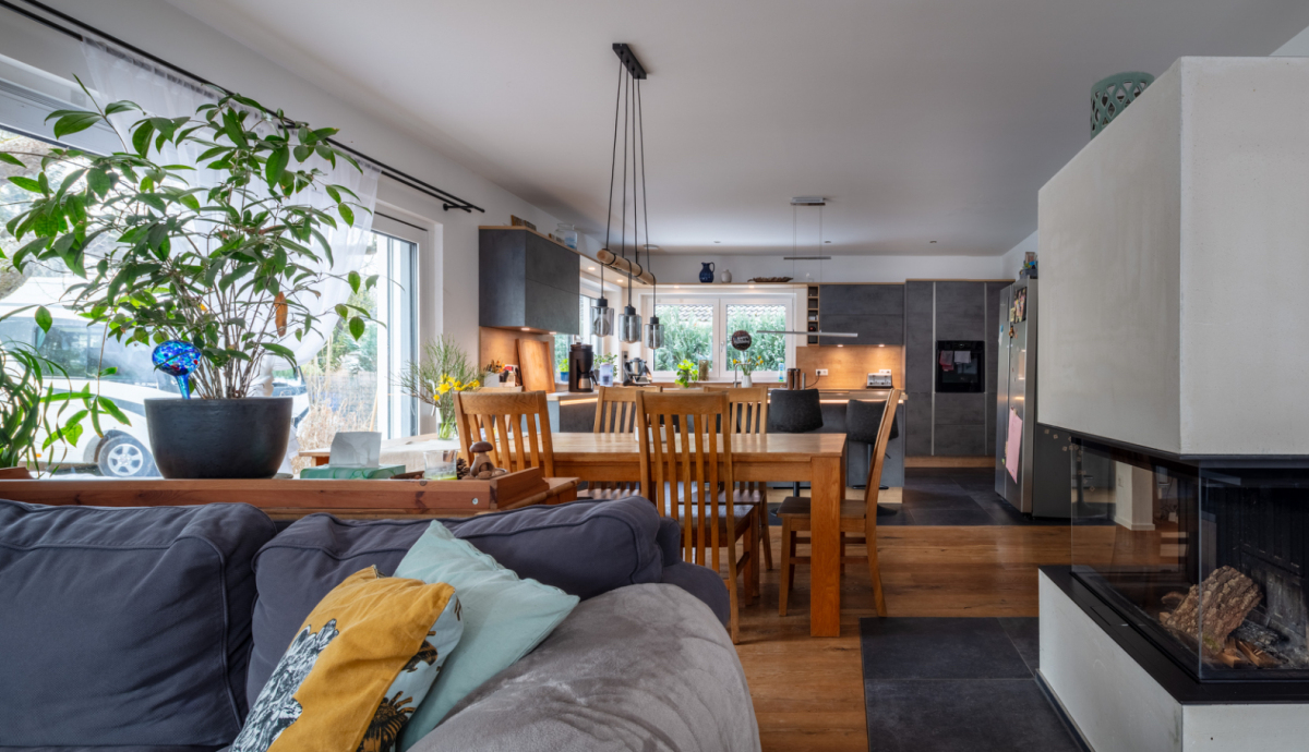 Bereits beim Betreten des Hauses wird die Offenheit des Grundrisses spürbar. Das Erdgeschoss wird durch einen weitläufigen Wohn- und Essbereich mit offener Küche geprägt. Großzügige Fensterflächen schaffen eine direkte Verbindung zur rund 88 m² großen, westlich ausgerichteten Terrasse und in den Gartenbereich mit Pool. Der Wohnraum wird zusätzlich durch einen Kamin ergänzt, der sowohl Atmosphäre als auch eine alternative Wärmequelle bietet. Neben der Küche befindet sich eine separate Pantry, die Funktionalität und Ordnung unterstützt.