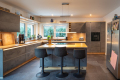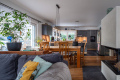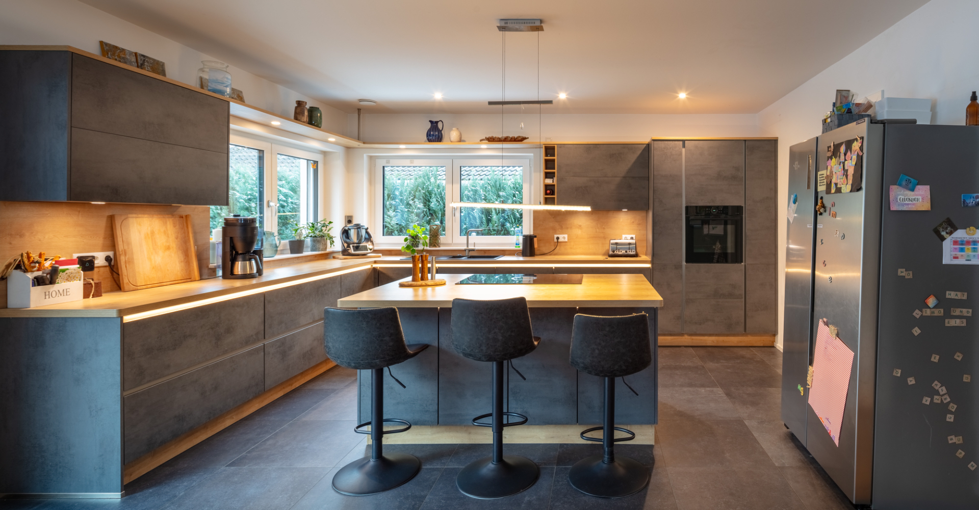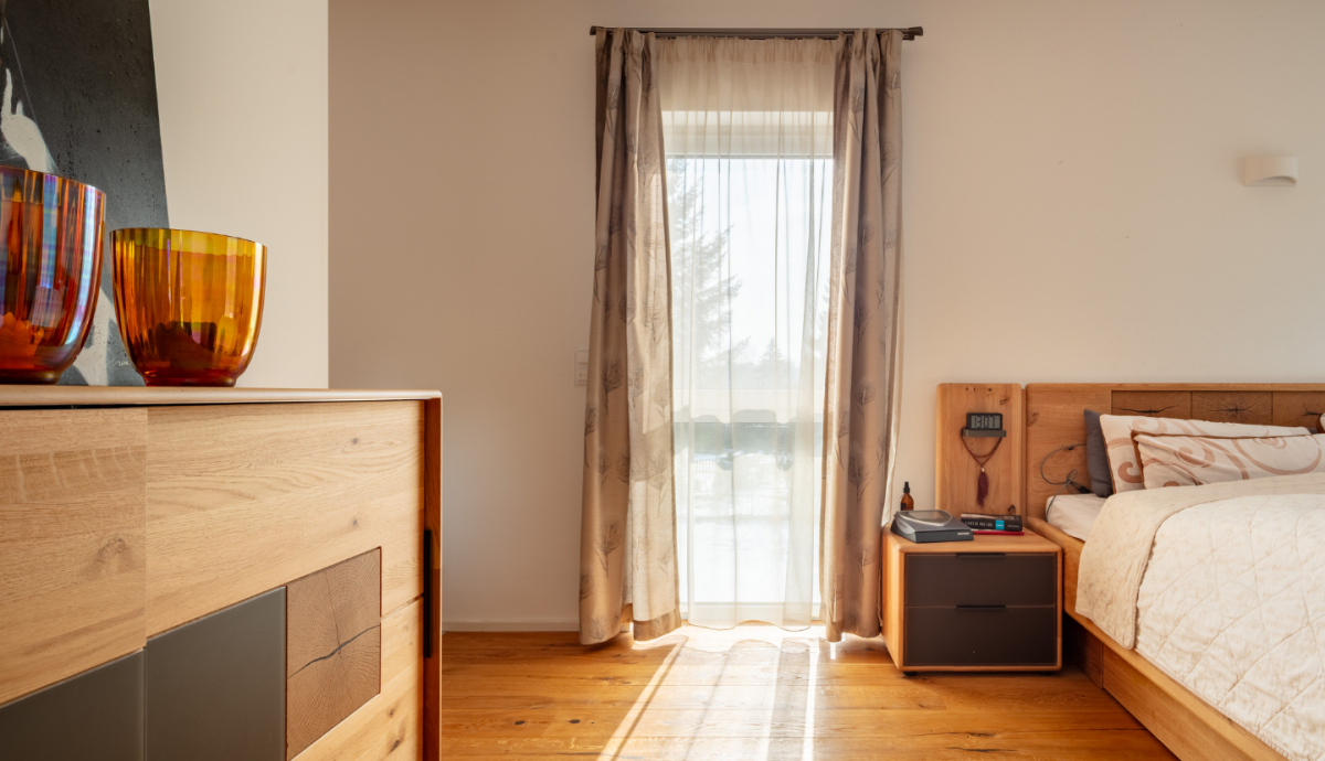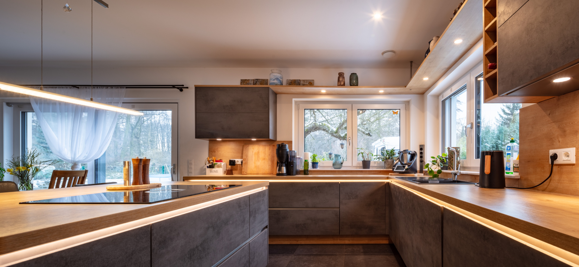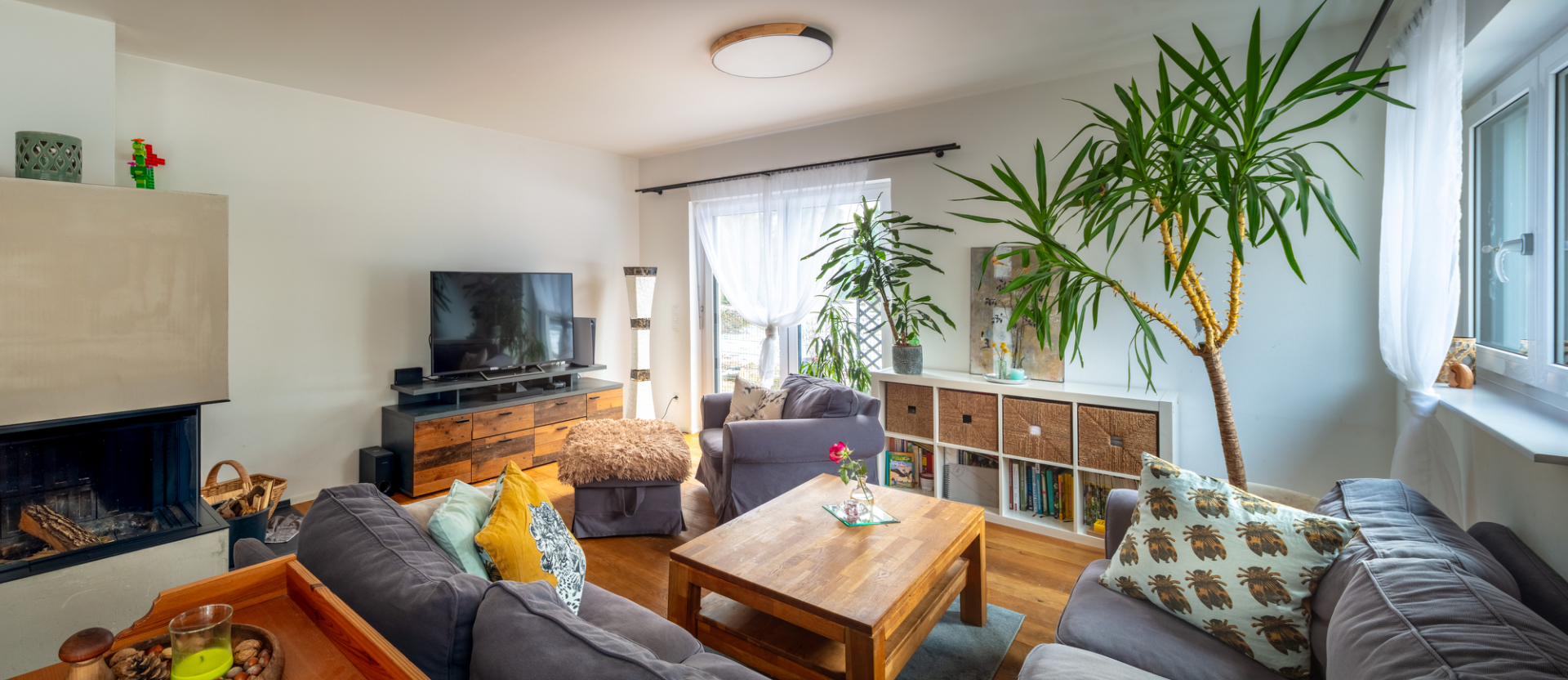 Bereits beim Betreten des Hauses wird die Offenheit des Grundrisses spürbar. Das Erdgeschoss wird durch einen weitläufigen Wohn- und Essbereich mit offener Küche geprägt. Großzügige Fensterflächen schaffen eine direkte Verbindung zur rund 88 m² großen, westlich ausgerichteten Terrasse und in den Gartenbereich mit Pool. Der Wohnraum wird zusätzlich durch einen Kamin ergänzt, der sowohl Atmosphäre als auch eine alternative Wärmequelle bietet. Neben der Küche befindet sich eine separate Pantry, die Funktionalität und Ordnung unterstützt.