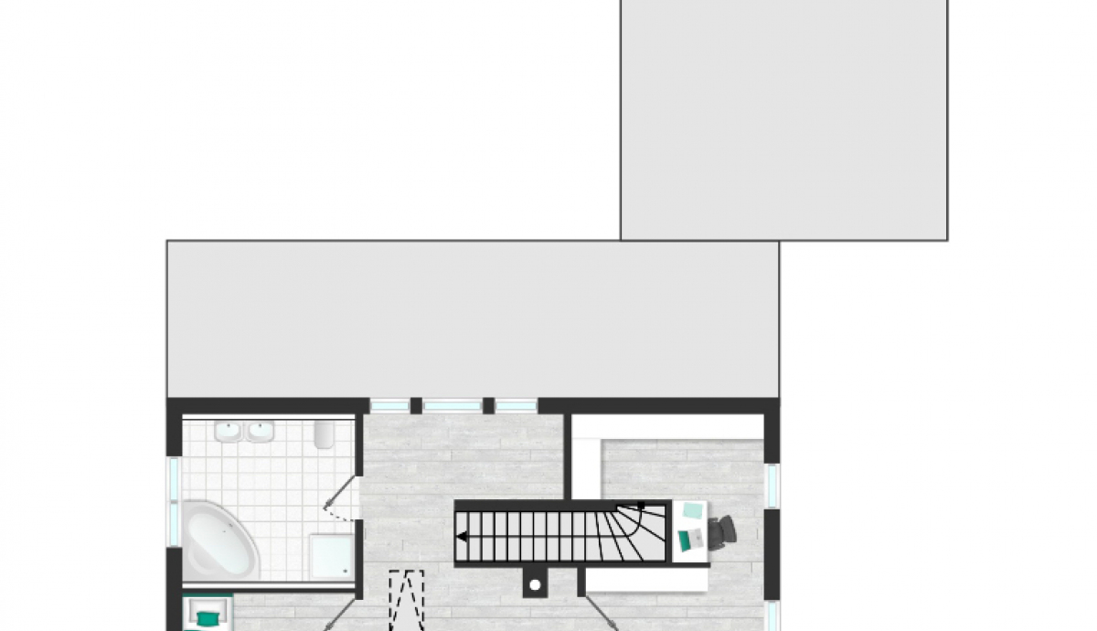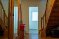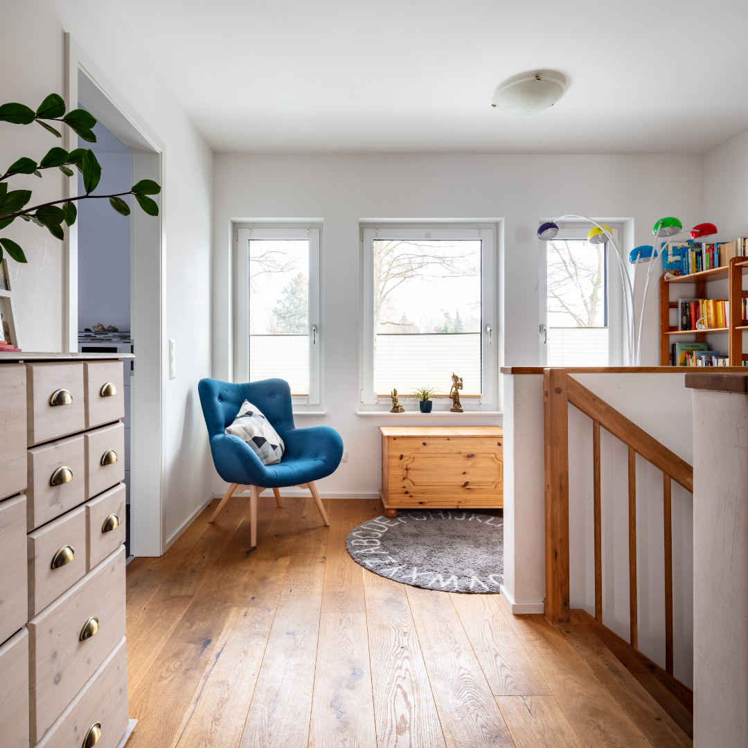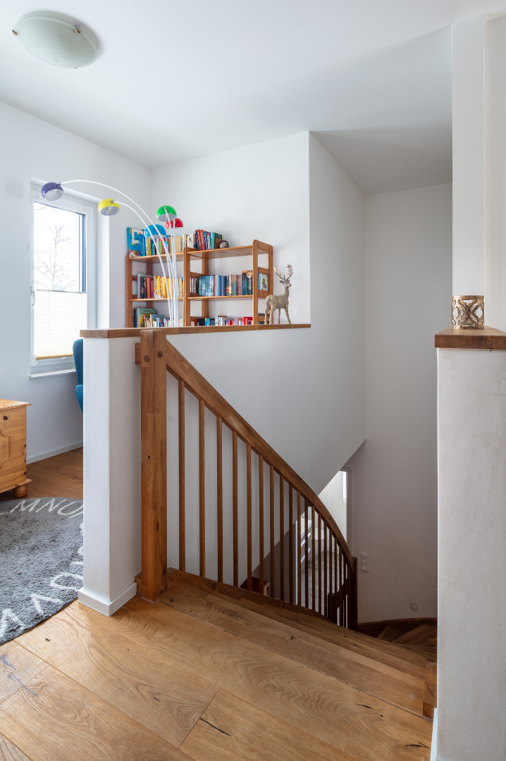 Im Obergeschoss stehen drei Schlafzimmer sowie ein großzügiges Badezimmer mit Wanne und Dusche zur Verfügung. Eine offene Galerie schafft räumliche Weite und verbindet die Ebenen über eine bemerkenswerte Treppe aus Eichenholz. Über dem Obergeschoss befindet sich ein nicht ausgebautes Kaltdach, das zusätzlichen Stauraum bietet.